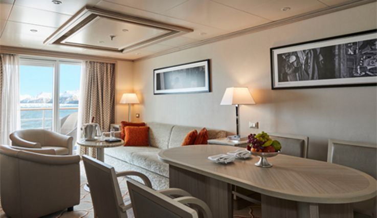 A Silversea signature, with a preferred central location, the Veranda Suite is spacious and welcoming.Floor-to-ceiling glass doors open onto a furnished private teak veranda from where you can contemplate anything from the midnight sun to an antarctic sunrise. The Deluxe Veranda Suite offers preferred central location with identical accommodation to a Veranda Suite.