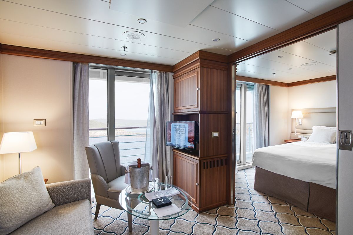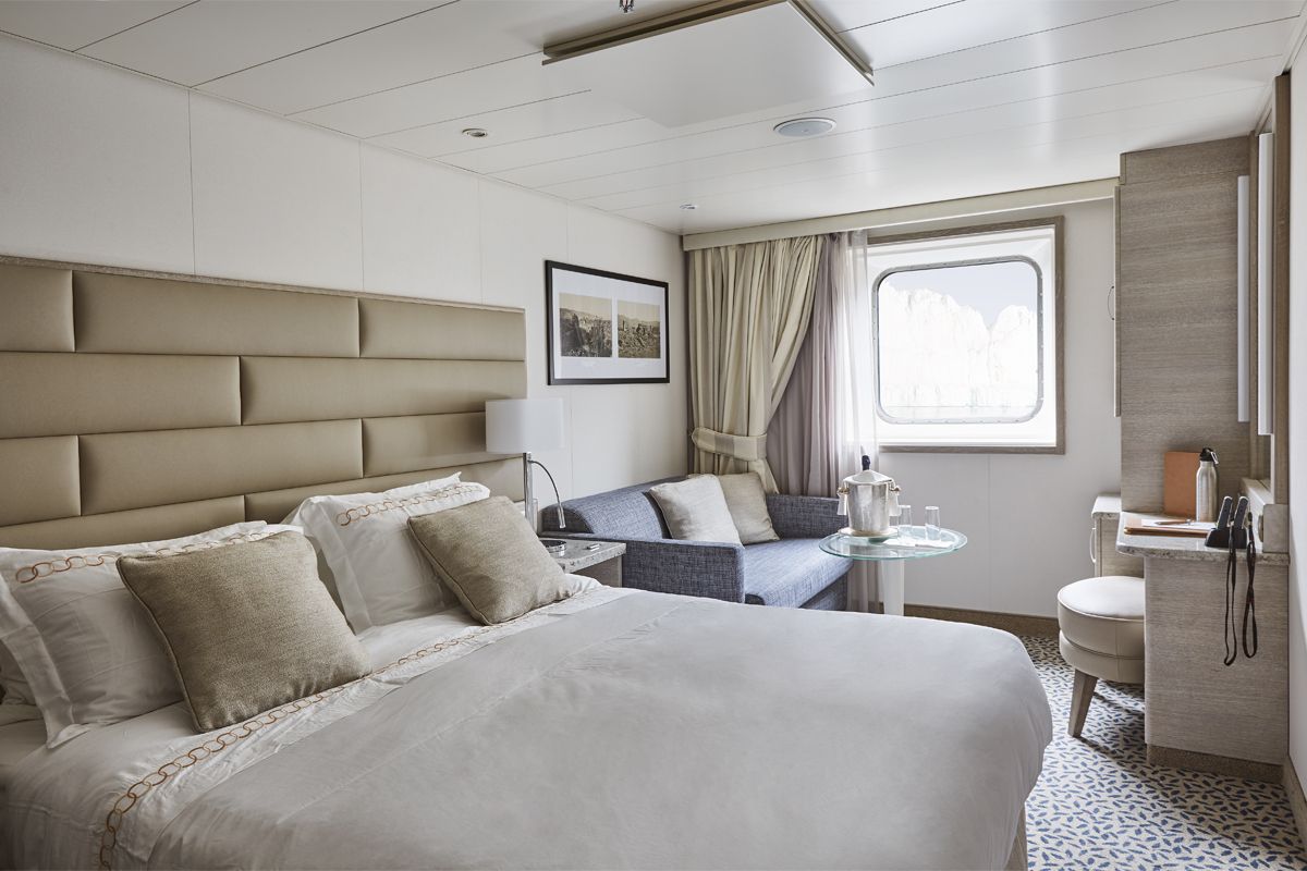 A Silversea cruise signature, complete with floor-to-ceiling glass doors that open onto a private balcony.